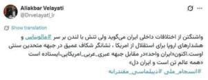 علیاکبر ولایتی، مشاور رهبر انقلاب در امور بینالملل نوشت: واشنگتن از اختلافات داخلی ایران میگوید ولی تنش با لندن بر سر مالویناس و هشدارهای اروپا برای استقلال از آمریکا، نشانگر شکاف عمیق در جبهه متحدین سنتی اوست.